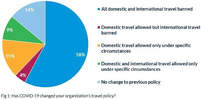 We surveyed more than 500 business travel and finance professionals from organizations across the globe about how the pandemic has impacted their organizations and their teams’ travel plans, and also when they anticipate getting started again. In total, 86% of responding organizations had either restricted or completely banned travel, with 58% banning any form of travel.