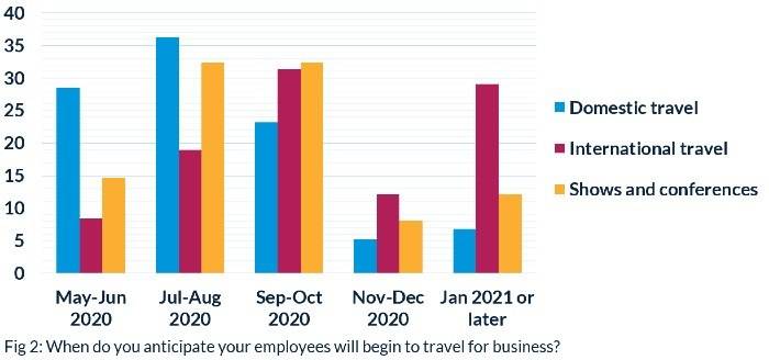 International travel is expected to start even more slowly, according to the survey. Just 9% of organizations anticipate international travel starting again before the end of June, with barely a quarter (27%) expecting employees to take overseas trips before the end of August. While this number grows significantly to 58% by the end of October, 29% of companies will not be planning overseas travel before 2021.
